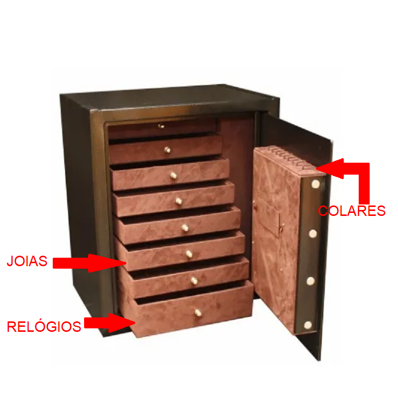 • Gaveteiro interno com 08 gavetas totalmente forradas para proteção de